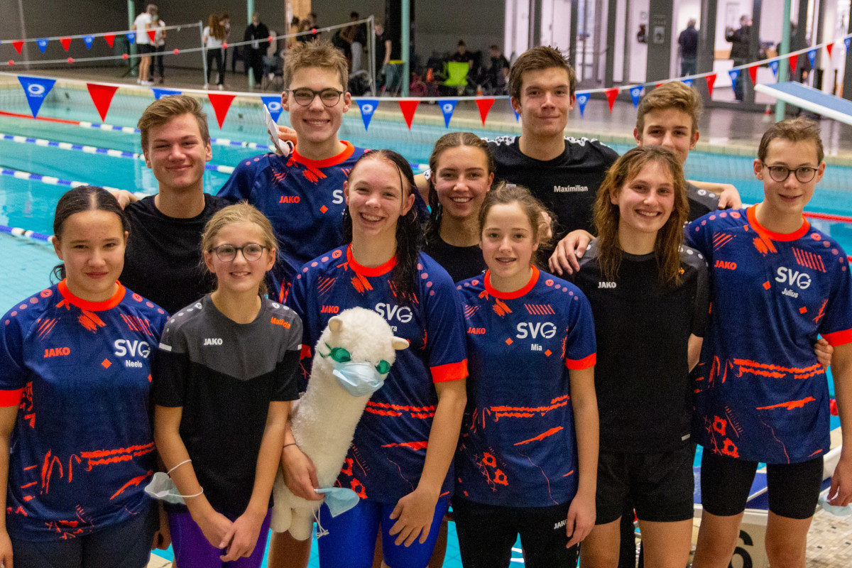 Für den SV Greven schwammen: Matilda Büchel, Hannah Grabbe, Sophie Kroner, Lara Nobbe, Neele Pfennig, Mia Schlusche und Lucy Springensguth, sowie Julius Domning, Justus Domning, Robert Hupka, Elijah Palkovic, Maximilian Schülling und Julius Vollenbröker